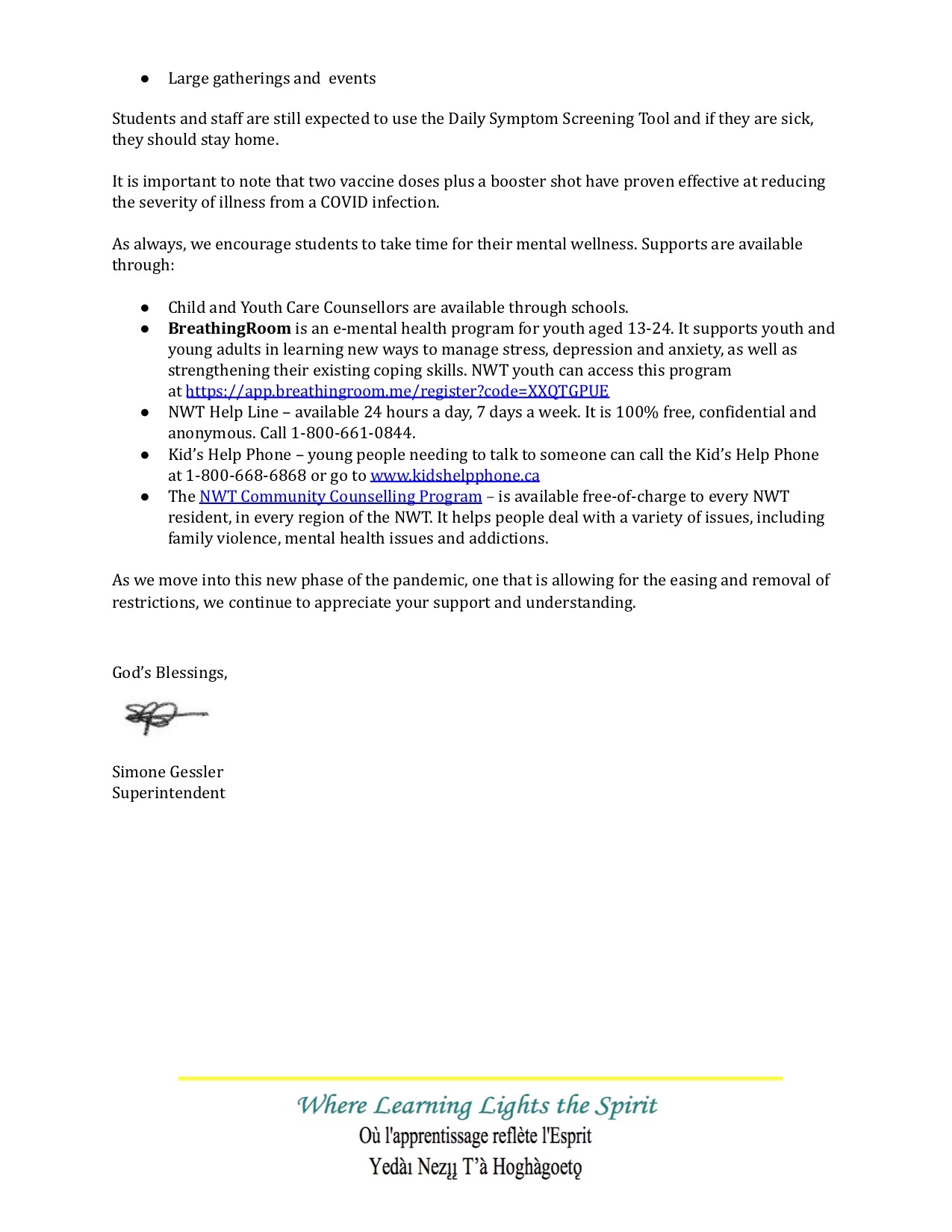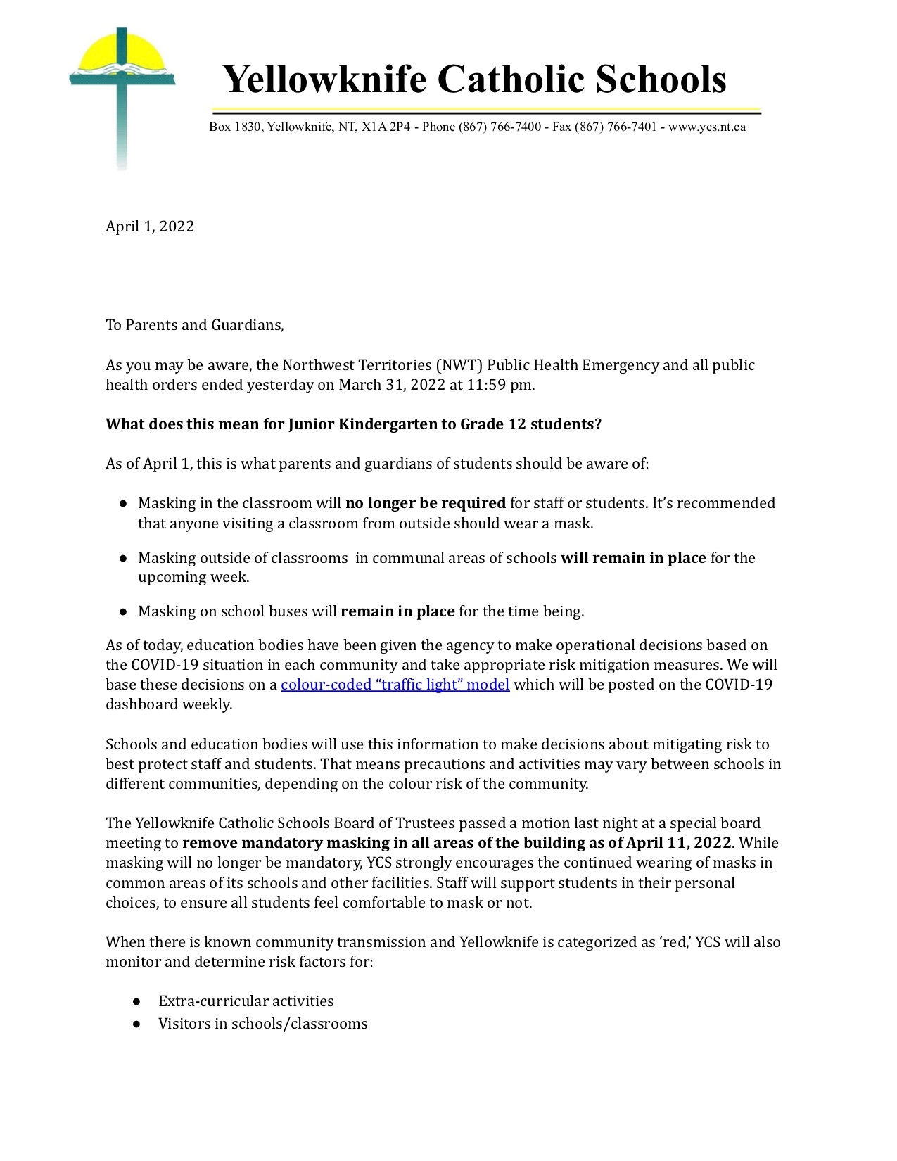 Please see the attached letter from our superintendent, Simone Gessler, regarding changes as a result of the Public Health Order ending.